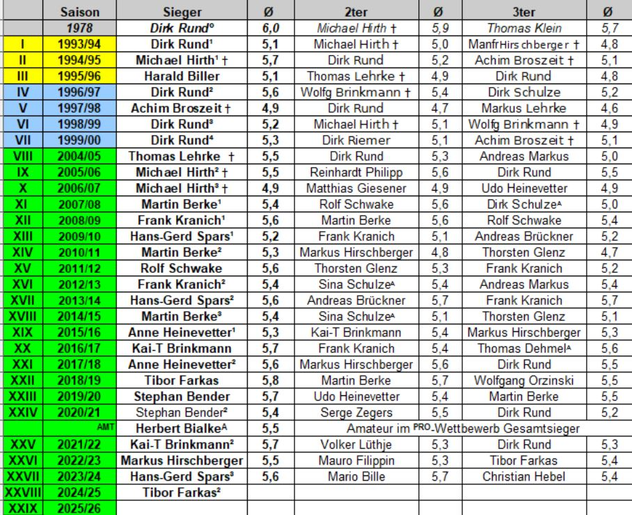 2013 Stephan Bender - 2014 Klaus Kreuch - 2015 und 2016 Markus Hirschberger² - 2017 Christian Brückner - 2018 Stephan Bender² - 2019 Wolfgang Orzinski - 2020 Stephan Bender³ (Pro) und Herbert Bialke (Gesamt) - 2021 und 2022 Volker Lüthje² - 2023 Dirk Rund - 2024 Christian Brückner² - 2025 Klaus Kreuch² - 2026 offen