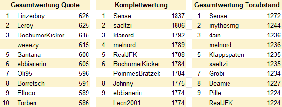 Es gibt drei Gesamtwertungen, für die jeweils die Punkte aus den einzelnen Tipprunden aufaddiert werden: