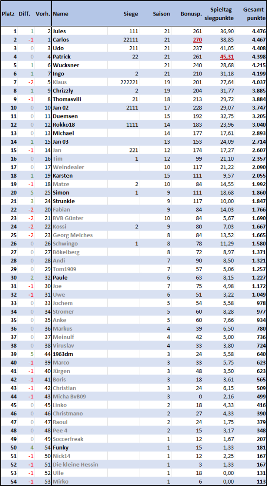 | Meiste Spieltagsiege aller Zeiten | Patrick | In 21 Jahren | 45,31 |