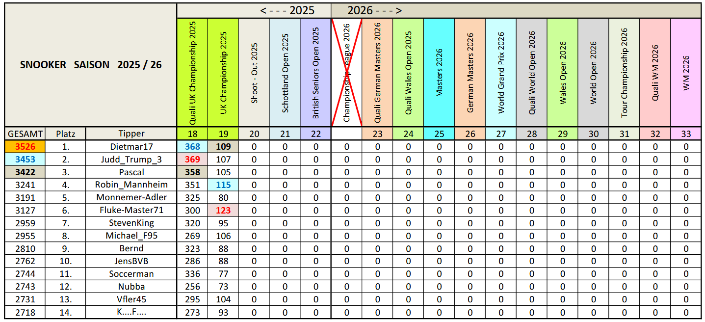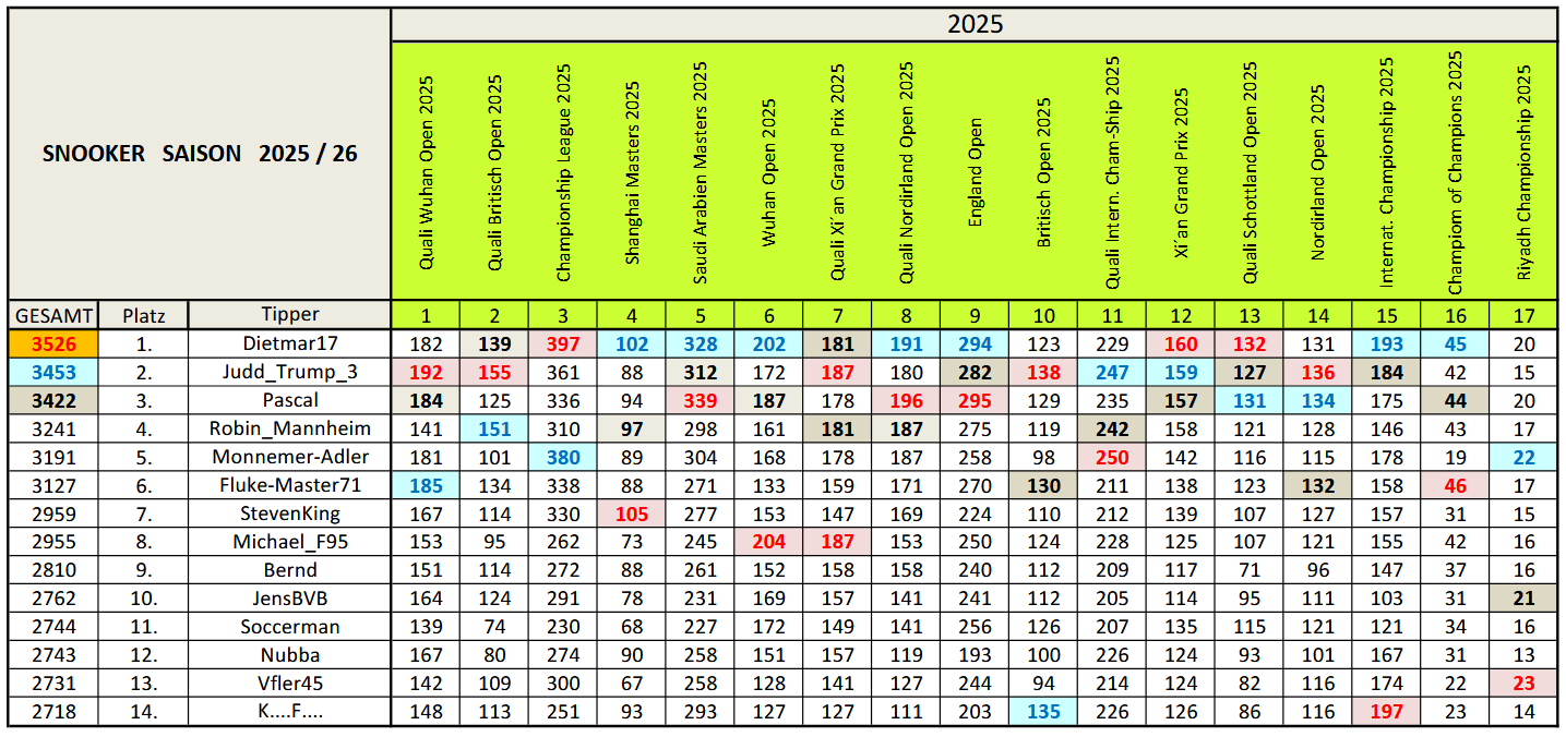 | Platz | Tipper | 🥇 | 🥈 | 🥉 | Pkt. | Anz. |