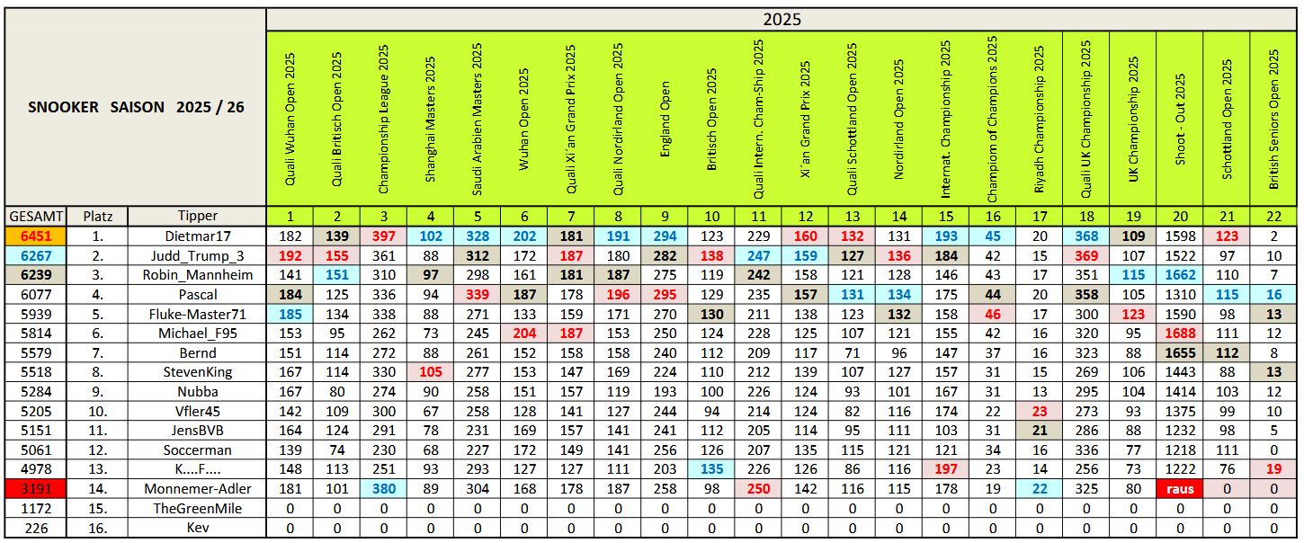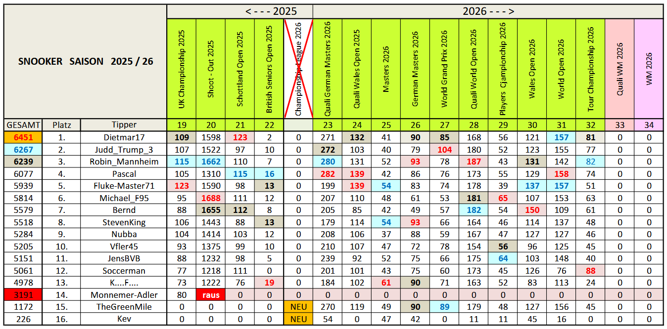 | Platz | Tipper | 🥇 | 🥈 | 🥉 | Pkt. | Anz. |
